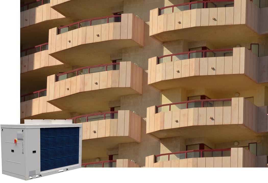 U usporedbi s obiteljskom kućom kojoj treba vlastiti sustav, u stambenim zgradama s centraliziranim sustavom treba koristiti jedinice koje mogu opskrbljivati različit broj stanova. Opet, brojke su tu važne. Mala zgrada sa šest stanova imat će znatno drugačije potrebe od većeg kompleksa.