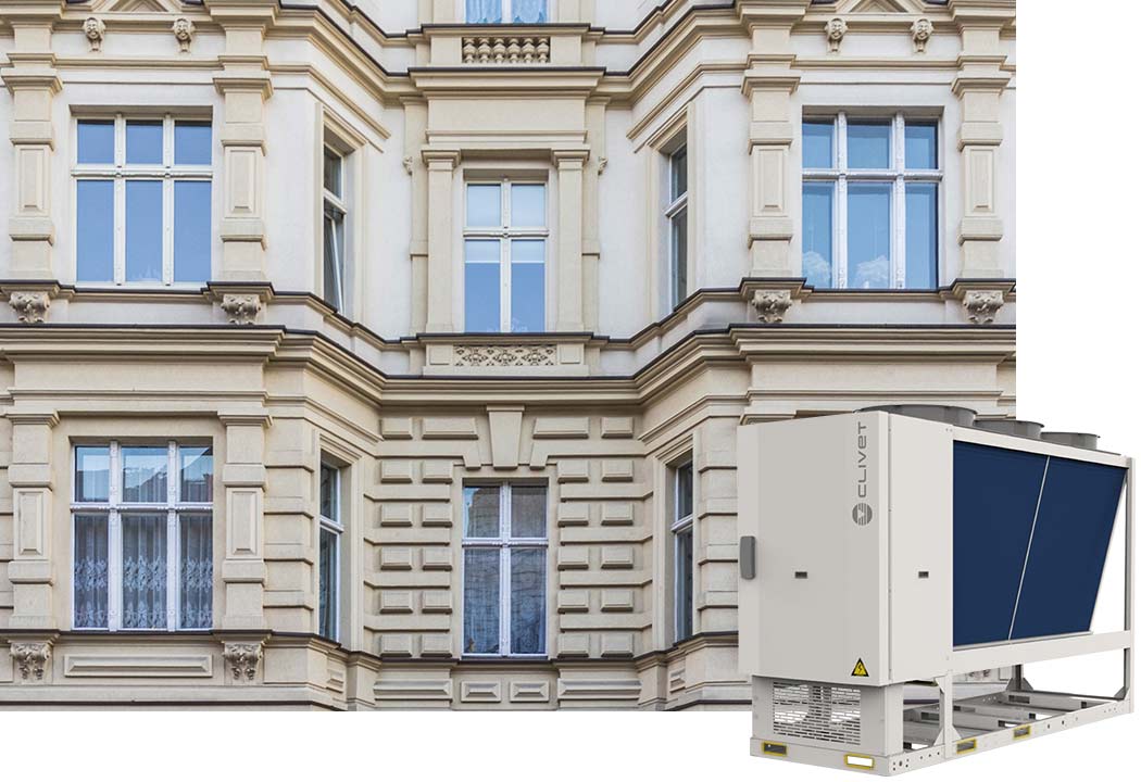 Clivet je osmislio niz specifičnih rješenja za centralizirane sustave u stambenim zgradama, koji se razlikuju prema veličini prostorija, a posebno prema vrsti razvodnih sustava.